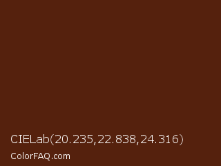 CIELab 20.235,22.838,24.316 Color is a very dark orange color and the nearest color is Seal Brown #59260b. Hex code #55210d and RGB value is rgb(85,33,13). In RGB color space, this color is composed of 33% red, 13% green, 5% blue, In CMYK color space, this color is composed of 0% cyan, 61% magenta, 85% yellow , 67% black , In HSL color space, this color has a hue angle of 17° , 73% saturation and 19% lightness.