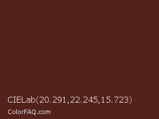 CIELab 20.291,22.245,15.723 Color is a very dark red color and the nearest color is Caput Mortuum #592720. Hex code #53221b and RGB value is rgb(83,34,27). In RGB color space, this color is composed of 33% red, 13% green, 11% blue, In CMYK color space, this color is composed of 0% cyan, 59% magenta, 67% yellow , 67% black , In HSL color space, this color has a hue angle of 8° , 51% saturation and 22% lightness.