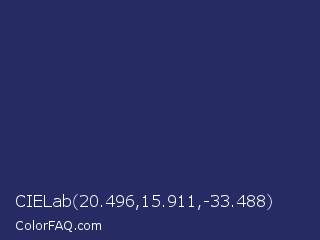 CIELab 20.496,15.911,-33.488 Color is a dark blue color and the nearest color is Biscay #1b3162. Hex code #262c63 and RGB value is rgb(38,44,99). In RGB color space, this color is composed of 15% red, 17% green, 39% blue, In CMYK color space, this color is composed of 62% cyan, 56% magenta, 0% yellow , 61% black , In HSL color space, this color has a hue angle of 234° , 45% saturation and 27% lightness.