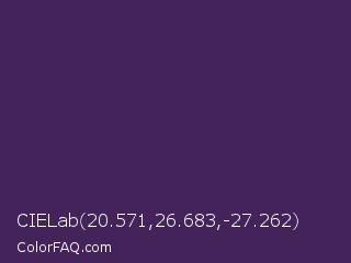 CIELab 20.571,26.683,-27.262 Color is a dark purple color and the nearest color is Bossanova #4e2a5a. Hex code #43235a and RGB value is rgb(67,35,90). In RGB color space, this color is composed of 26% red, 14% green, 35% blue, In CMYK color space, this color is composed of 26% cyan, 61% magenta, 0% yellow , 65% black , In HSL color space, this color has a hue angle of 275° , 44% saturation and 25% lightness.