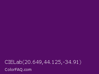 CIELab 20.649,44.125,-34.91 Color is a very dark purple color and the nearest color is Honey Flower #4f1c70. Hex code #550c66 and RGB value is rgb(85,12,102). In RGB color space, this color is composed of 33% red, 5% green, 40% blue, In CMYK color space, this color is composed of 17% cyan, 88% magenta, 0% yellow , 60% black , In HSL color space, this color has a hue angle of 289° , 79% saturation and 22% lightness.