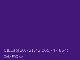 CIELab 20.721,42.065,-47.864 Color is a dark violet color and the nearest color is Meteorite #3c1f76. Hex code #43167a and RGB value is rgb(67,22,122). In RGB color space, this color is composed of 26% red, 9% green, 48% blue, In CMYK color space, this color is composed of 45% cyan, 82% magenta, 0% yellow , 52% black , In HSL color space, this color has a hue angle of 267° , 69% saturation and 28% lightness.