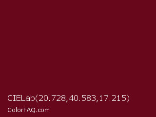CIELab 20.728,40.583,17.215 Color is a very dark red color and the nearest color is Bordeaux #5c0120. Hex code #68071b and RGB value is rgb(104,7,27). In RGB color space, this color is composed of 41% red, 3% green, 11% blue, In CMYK color space, this color is composed of 0% cyan, 93% magenta, 74% yellow , 59% black , In HSL color space, this color has a hue angle of 348° , 87% saturation and 22% lightness.