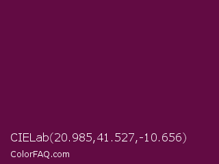 CIELab 20.985,41.527,-10.656 Color is a very dark magenta color and the nearest color is Pompadour #660045. Hex code #620b43 and RGB value is rgb(98,11,67). In RGB color space, this color is composed of 38% red, 4% green, 26% blue, In CMYK color space, this color is composed of 0% cyan, 89% magenta, 32% yellow , 62% black , In HSL color space, this color has a hue angle of 321° , 80% saturation and 21% lightness.