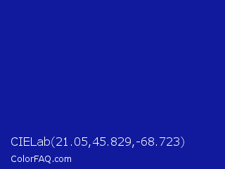CIELab 21.05,45.829,-68.723 Color is a normal blue color and the nearest color is Indigo Dye #091f92. Hex code #111a9c and RGB value is rgb(17,26,156). In RGB color space, this color is composed of 7% red, 10% green, 61% blue, In CMYK color space, this color is composed of 89% cyan, 83% magenta, 0% yellow , 39% black , In HSL color space, this color has a hue angle of 236° , 80% saturation and 34% lightness.