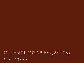 CIELab 21.133,28.657,27.125 Color is a very dark red color and the nearest color is Redwood #5d1e0f. Hex code #5e1d0a and RGB value is rgb(94,29,10). In RGB color space, this color is composed of 37% red, 11% green, 4% blue, In CMYK color space, this color is composed of 0% cyan, 69% magenta, 89% yellow , 63% black , In HSL color space, this color has a hue angle of 14° , 81% saturation and 20% lightness.