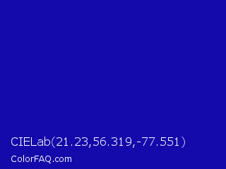 CIELab 21.23,56.319,-77.551 Color is a normal indigo color and the nearest color is Zaffre #0014a8. Hex code #140aab and RGB value is rgb(20,10,171). In RGB color space, this color is composed of 8% red, 4% green, 67% blue, In CMYK color space, this color is composed of 88% cyan, 94% magenta, 0% yellow , 33% black , In HSL color space, this color has a hue angle of 244° , 89% saturation and 35% lightness.
