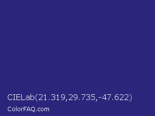 CIELab 21.319,29.735,-47.622 Color is a normal indigo color and the nearest color is St Patricks Blue #23297a. Hex code #2b267b and RGB value is rgb(43,38,123). In RGB color space, this color is composed of 17% red, 15% green, 48% blue, In CMYK color space, this color is composed of 65% cyan, 69% magenta, 0% yellow , 52% black , In HSL color space, this color has a hue angle of 244° , 53% saturation and 32% lightness.