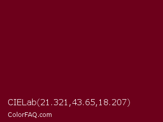 CIELab 21.321,43.65,18.207 Color is a very dark red color and the nearest color is Venetian Red #72010f. Hex code #6d001b and RGB value is rgb(109,0,27). In RGB color space, this color is composed of 43% red, 0% green, 11% blue, In CMYK color space, this color is composed of 0% cyan, 100% magenta, 75% yellow , 57% black , In HSL color space, this color has a hue angle of 345° , 100% saturation and 21% lightness.