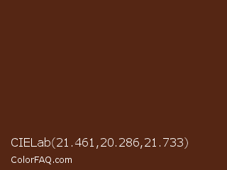 CIELab 21.461,20.286,21.733 Color is a very dark orange color and the nearest color is Cioccolato #55280c. Hex code #552614 and RGB value is rgb(85,38,20). In RGB color space, this color is composed of 33% red, 15% green, 8% blue, In CMYK color space, this color is composed of 0% cyan, 55% magenta, 76% yellow , 67% black , In HSL color space, this color has a hue angle of 17° , 62% saturation and 21% lightness.