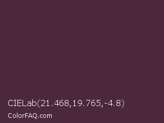 CIELab 21.468,19.765,-4.8 Color is a dark rose color and the nearest color is Livid Brown #4d282e. Hex code #4c283b and RGB value is rgb(76,40,59). In RGB color space, this color is composed of 30% red, 16% green, 23% blue, In CMYK color space, this color is composed of 0% cyan, 47% magenta, 22% yellow , 70% black , In HSL color space, this color has a hue angle of 328° , 31% saturation and 23% lightness.