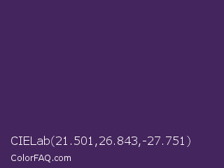CIELab 21.501,26.843,-27.751 Color is a dark purple color and the nearest color is Bossanova #4e2a5a. Hex code #45255d and RGB value is rgb(69,37,93). In RGB color space, this color is composed of 27% red, 15% green, 36% blue, In CMYK color space, this color is composed of 26% cyan, 60% magenta, 0% yellow , 64% black , In HSL color space, this color has a hue angle of 274° , 43% saturation and 25% lightness.