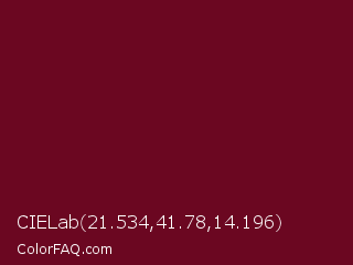 CIELab 21.534,41.78,14.196 Color is a very dark rose color and the nearest color is Black Rose #67032d. Hex code #6b0721 and RGB value is rgb(107,7,33). In RGB color space, this color is composed of 42% red, 3% green, 13% blue, In CMYK color space, this color is composed of 0% cyan, 93% magenta, 69% yellow , 58% black , In HSL color space, this color has a hue angle of 344° , 88% saturation and 22% lightness.