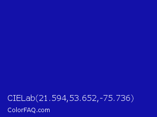 CIELab 21.594,53.652,-75.736 Color is a normal indigo color and the nearest color is Zaffre #0014a8. Hex code #1311a9 and RGB value is rgb(19,17,169). In RGB color space, this color is composed of 7% red, 7% green, 66% blue, In CMYK color space, this color is composed of 89% cyan, 90% magenta, 0% yellow , 34% black , In HSL color space, this color has a hue angle of 241° , 82% saturation and 36% lightness.