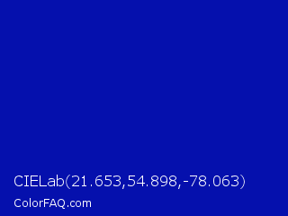 CIELab 21.653,54.898,-78.063 Color is a normal blue color and the nearest color is Zaffre #0014a8. Hex code #0510ad and RGB value is rgb(5,16,173). In RGB color space, this color is composed of 2% red, 6% green, 68% blue, In CMYK color space, this color is composed of 97% cyan, 91% magenta, 0% yellow , 32% black , In HSL color space, this color has a hue angle of 236° , 94% saturation and 35% lightness.