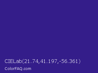 CIELab 21.74,41.197,-56.361 Color is a normal indigo color and the nearest color is Pixie Powder #391285. Hex code #341d8a and RGB value is rgb(52,29,138). In RGB color space, this color is composed of 20% red, 11% green, 54% blue, In CMYK color space, this color is composed of 62% cyan, 79% magenta, 0% yellow , 46% black , In HSL color space, this color has a hue angle of 253° , 65% saturation and 33% lightness.