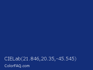 CIELab 21.846,20.35,-45.545 Color is a dark blue color and the nearest color is Catalina Blue #062a78. Hex code #132e79 and RGB value is rgb(19,46,121). In RGB color space, this color is composed of 7% red, 18% green, 47% blue, In CMYK color space, this color is composed of 84% cyan, 62% magenta, 0% yellow , 53% black , In HSL color space, this color has a hue angle of 224° , 73% saturation and 27% lightness.