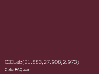 CIELab 21.883,27.908,2.973 Color is a dark rose color and the nearest color is Wine Berry #591d35. Hex code #5a2131 and RGB value is rgb(90,33,49). In RGB color space, this color is composed of 35% red, 13% green, 19% blue, In CMYK color space, this color is composed of 0% cyan, 63% magenta, 46% yellow , 65% black , In HSL color space, this color has a hue angle of 343° , 46% saturation and 24% lightness.