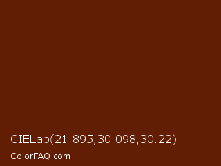 CIELab 21.895,30.098,30.22 Color is a very dark color and the nearest color is Redwood #5d1e0f. Hex code #621d05 and RGB value is rgb(98,29,5). In RGB color space, this color is composed of 38% red, 11% green, 2% blue, In CMYK color space, this color is composed of 0% cyan, 70% magenta, 95% yellow , 62% black , In HSL color space, this color has a hue angle of 15° , 90% saturation and 20% lightness.