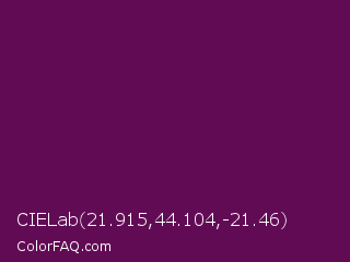 CIELab 21.915,44.104,-21.46 Color is a very dark magenta color and the nearest color is Pompadour #660045. Hex code #620b55 and RGB value is rgb(98,11,85). In RGB color space, this color is composed of 38% red, 4% green, 33% blue, In CMYK color space, this color is composed of 0% cyan, 89% magenta, 13% yellow , 62% black , In HSL color space, this color has a hue angle of 309° , 80% saturation and 21% lightness.