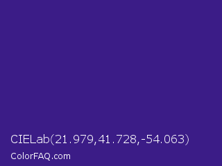 CIELab 21.979,41.728,-54.063 Color is a normal indigo color and the nearest color is Pixie Powder #391285. Hex code #3b1c87 and RGB value is rgb(59,28,135). In RGB color space, this color is composed of 23% red, 11% green, 53% blue, In CMYK color space, this color is composed of 56% cyan, 79% magenta, 0% yellow , 47% black , In HSL color space, this color has a hue angle of 257° , 66% saturation and 32% lightness.