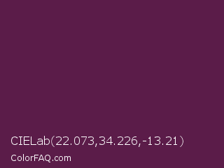 CIELab 22.073,34.226,-13.21 Color is a dark magenta color and the nearest color is Tawny Port #692545. Hex code #5b1c49 and RGB value is rgb(91,28,73). In RGB color space, this color is composed of 36% red, 11% green, 29% blue, In CMYK color space, this color is composed of 0% cyan, 69% magenta, 20% yellow , 64% black , In HSL color space, this color has a hue angle of 317° , 53% saturation and 23% lightness.