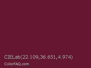 CIELab 22.109,36.651,4.974 Color is a dark rose color and the nearest color is Wine Berry #591d35. Hex code #65162f and RGB value is rgb(101,22,47). In RGB color space, this color is composed of 40% red, 9% green, 18% blue, In CMYK color space, this color is composed of 0% cyan, 78% magenta, 53% yellow , 60% black , In HSL color space, this color has a hue angle of 341° , 64% saturation and 24% lightness.