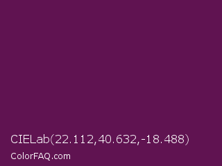 CIELab 22.112,40.632,-18.488 Color is a dark magenta color and the nearest color is Pompadour #660045. Hex code #601351 and RGB value is rgb(96,19,81). In RGB color space, this color is composed of 38% red, 7% green, 32% blue, In CMYK color space, this color is composed of 0% cyan, 80% magenta, 16% yellow , 62% black , In HSL color space, this color has a hue angle of 312° , 67% saturation and 23% lightness.