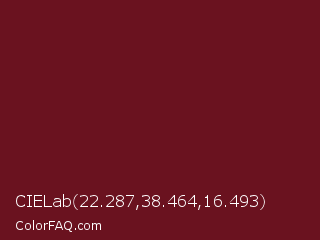 CIELab 22.287,38.464,16.493 Color is a dark red color and the nearest color is Persian Plum #701c1c. Hex code #6a121f and RGB value is rgb(106,18,31). In RGB color space, this color is composed of 42% red, 7% green, 12% blue, In CMYK color space, this color is composed of 0% cyan, 83% magenta, 71% yellow , 58% black , In HSL color space, this color has a hue angle of 351° , 71% saturation and 24% lightness.