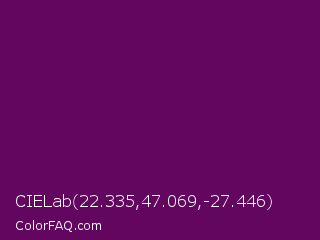 CIELab 22.335,47.069,-27.446 Color is a very dark magenta color and the nearest color is Pompadour #660045. Hex code #63065f and RGB value is rgb(99,6,95). In RGB color space, this color is composed of 39% red, 2% green, 37% blue, In CMYK color space, this color is composed of 0% cyan, 94% magenta, 4% yellow , 61% black , In HSL color space, this color has a hue angle of 303° , 89% saturation and 21% lightness.