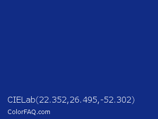 CIELab 22.352,26.495,-52.302 Color is a dark blue color and the nearest color is Catalina Blue #062a78. Hex code #112c85 and RGB value is rgb(17,44,133). In RGB color space, this color is composed of 7% red, 17% green, 52% blue, In CMYK color space, this color is composed of 87% cyan, 67% magenta, 0% yellow , 48% black , In HSL color space, this color has a hue angle of 226° , 77% saturation and 29% lightness.
