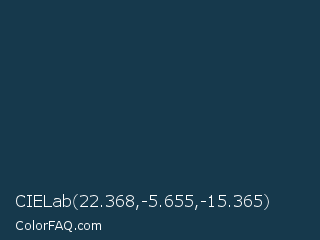 CIELab 22.368,-5.655,-15.365 Color is a very dark blue color and the nearest color is Nile Blue #193751. Hex code #16394c and RGB value is rgb(22,57,76). In RGB color space, this color is composed of 9% red, 22% green, 30% blue, In CMYK color space, this color is composed of 71% cyan, 25% magenta, 0% yellow , 70% black , In HSL color space, this color has a hue angle of 201° , 55% saturation and 19% lightness.