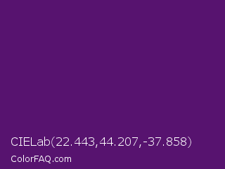 CIELab 22.443,44.207,-37.858 Color is a dark purple color and the nearest color is Honey Flower #4f1c70. Hex code #57136f and RGB value is rgb(87,19,111). In RGB color space, this color is composed of 34% red, 7% green, 44% blue, In CMYK color space, this color is composed of 22% cyan, 83% magenta, 0% yellow , 56% black , In HSL color space, this color has a hue angle of 284° , 71% saturation and 25% lightness.