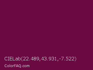 CIELab 22.489,43.931,-7.522 Color is a dark magenta color and the nearest color is Tyrian Purple #66023c. Hex code #6a0942 and RGB value is rgb(106,9,66). In RGB color space, this color is composed of 42% red, 4% green, 26% blue, In CMYK color space, this color is composed of 0% cyan, 92% magenta, 38% yellow , 58% black , In HSL color space, this color has a hue angle of 325° , 84% saturation and 23% lightness.