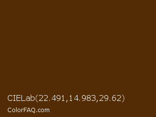 CIELab 22.491,14.983,29.62 Color is a very dark orange color and the nearest color is Cioccolato #55280c. Hex code #532c06 and RGB value is rgb(83,44,6). In RGB color space, this color is composed of 33% red, 17% green, 2% blue, In CMYK color space, this color is composed of 0% cyan, 47% magenta, 93% yellow , 67% black , In HSL color space, this color has a hue angle of 30° , 87% saturation and 17% lightness.