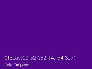 CIELab 22.527,52.14,-54.317 Color is a dark purple color and the nearest color is Pigment Indigo #4b0082. Hex code #500789 and RGB value is rgb(80,7,137). In RGB color space, this color is composed of 31% red, 3% green, 54% blue, In CMYK color space, this color is composed of 42% cyan, 95% magenta, 0% yellow , 46% black , In HSL color space, this color has a hue angle of 274° , 90% saturation and 28% lightness.