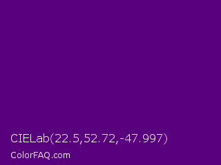 CIELab 22.5,52.72,-47.997 Color is a dark purple color and the nearest color is Pigment Indigo #4b0082. Hex code #59007f and RGB value is rgb(89,0,127). In RGB color space, this color is composed of 35% red, 0% green, 50% blue, In CMYK color space, this color is composed of 30% cyan, 100% magenta, 0% yellow , 50% black , In HSL color space, this color has a hue angle of 282° , 100% saturation and 25% lightness.