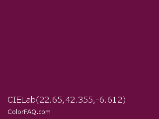 CIELab 22.65,42.355,-6.612 Color is a dark magenta color and the nearest color is Tyrian Purple #66023c. Hex code #690e41 and RGB value is rgb(105,14,65). In RGB color space, this color is composed of 41% red, 5% green, 25% blue, In CMYK color space, this color is composed of 0% cyan, 87% magenta, 38% yellow , 59% black , In HSL color space, this color has a hue angle of 326° , 76% saturation and 23% lightness.