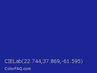 CIELab 22.744,37.869,-61.595 Color is a normal blue color and the nearest color is Jacksons Purple #20208d. Hex code #1b2595 and RGB value is rgb(27,37,149). In RGB color space, this color is composed of 11% red, 15% green, 58% blue, In CMYK color space, this color is composed of 82% cyan, 75% magenta, 0% yellow , 42% black , In HSL color space, this color has a hue angle of 235° , 69% saturation and 35% lightness.