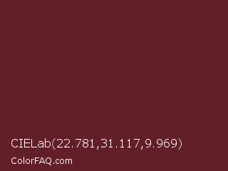 CIELab 22.781,31.117,9.969 Color is a dark red color and the nearest color is Caput Mortuum #592720. Hex code #621f29 and RGB value is rgb(98,31,41). In RGB color space, this color is composed of 38% red, 12% green, 16% blue, In CMYK color space, this color is composed of 0% cyan, 68% magenta, 58% yellow , 62% black , In HSL color space, this color has a hue angle of 351° , 52% saturation and 25% lightness.