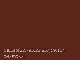 CIELab 22.795,23.857,19.164 Color is a dark red color and the nearest color is Caput Mortuum #592720. Hex code #5c261b and RGB value is rgb(92,38,27). In RGB color space, this color is composed of 36% red, 15% green, 11% blue, In CMYK color space, this color is composed of 0% cyan, 59% magenta, 71% yellow , 64% black , In HSL color space, this color has a hue angle of 10° , 55% saturation and 23% lightness.