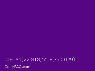 CIELab 22.818,51.8,-50.029 Color is a dark purple color and the nearest color is Pigment Indigo #4b0082. Hex code #560683 and RGB value is rgb(86,6,131). In RGB color space, this color is composed of 34% red, 2% green, 51% blue, In CMYK color space, this color is composed of 34% cyan, 95% magenta, 0% yellow , 49% black , In HSL color space, this color has a hue angle of 278° , 91% saturation and 27% lightness.