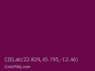 CIELab 22.829,45.795,-12.46 Color is a very dark magenta color and the nearest color is Pompadour #660045. Hex code #6b064a and RGB value is rgb(107,6,74). In RGB color space, this color is composed of 42% red, 2% green, 29% blue, In CMYK color space, this color is composed of 0% cyan, 94% magenta, 31% yellow , 58% black , In HSL color space, this color has a hue angle of 320° , 89% saturation and 22% lightness.