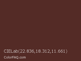 CIELab 22.836,18.312,11.661 Color is a dark red color and the nearest color is Caput Mortuum #592720. Hex code #542b26 and RGB value is rgb(84,43,38). In RGB color space, this color is composed of 33% red, 17% green, 15% blue, In CMYK color space, this color is composed of 0% cyan, 49% magenta, 55% yellow , 67% black , In HSL color space, this color has a hue angle of 7° , 38% saturation and 24% lightness.