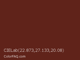 CIELab 22.873,27.133,20.08 Color is a dark red color and the nearest color is Espresso #612718. Hex code #60231a and RGB value is rgb(96,35,26). In RGB color space, this color is composed of 38% red, 14% green, 10% blue, In CMYK color space, this color is composed of 0% cyan, 64% magenta, 73% yellow , 62% black , In HSL color space, this color has a hue angle of 8° , 57% saturation and 24% lightness.