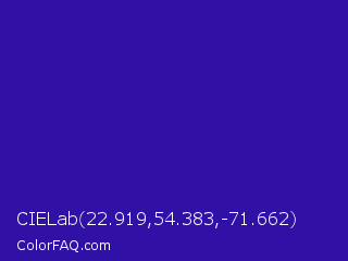 CIELab 22.919,54.383,-71.662 Color is a normal indigo color and the nearest color is Blue Gem #2c0e8c. Hex code #3110a6 and RGB value is rgb(49,16,166). In RGB color space, this color is composed of 19% red, 6% green, 65% blue, In CMYK color space, this color is composed of 70% cyan, 90% magenta, 0% yellow , 35% black , In HSL color space, this color has a hue angle of 253° , 82% saturation and 36% lightness.