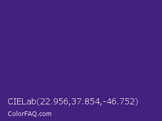CIELab 22.956,37.854,-46.752 Color is a normal violet color and the nearest color is Meteorite #3c1f76. Hex code #43217e and RGB value is rgb(67,33,126). In RGB color space, this color is composed of 26% red, 13% green, 49% blue, In CMYK color space, this color is composed of 47% cyan, 74% magenta, 0% yellow , 51% black , In HSL color space, this color has a hue angle of 262° , 58% saturation and 31% lightness.