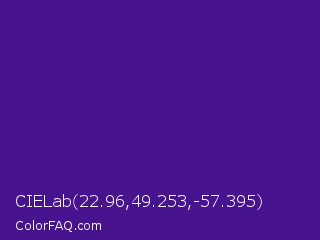 CIELab 22.96,49.253,-57.395 Color is a normal violet color and the nearest color is Pixie Powder #391285. Hex code #47138f and RGB value is rgb(71,19,143). In RGB color space, this color is composed of 28% red, 7% green, 56% blue, In CMYK color space, this color is composed of 50% cyan, 87% magenta, 0% yellow , 44% black , In HSL color space, this color has a hue angle of 265° , 77% saturation and 32% lightness.