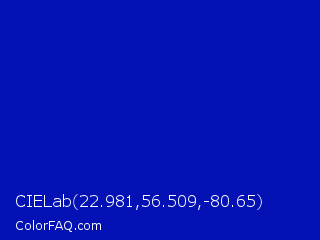 CIELab 22.981,56.509,-80.65 Color is a normal blue color and the nearest color is Zaffre #0014a8. Hex code #0412b5 and RGB value is rgb(4,18,181). In RGB color space, this color is composed of 2% red, 7% green, 71% blue, In CMYK color space, this color is composed of 98% cyan, 90% magenta, 0% yellow , 29% black , In HSL color space, this color has a hue angle of 235° , 96% saturation and 36% lightness.