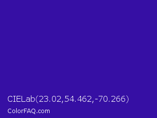CIELab 23.02,54.462,-70.266 Color is a normal indigo color and the nearest color is Blue Gem #2c0e8c. Hex code #360fa4 and RGB value is rgb(54,15,164). In RGB color space, this color is composed of 21% red, 6% green, 64% blue, In CMYK color space, this color is composed of 67% cyan, 91% magenta, 0% yellow , 36% black , In HSL color space, this color has a hue angle of 256° , 83% saturation and 35% lightness.